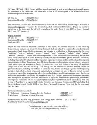 Xcel Energy announced its second quarter 2006 earnings. Income from continuing operations was $98 million compared to $78 million in the second quarter of 2005. Net income was also $98 million compared to $83 million in the prior year. Increased earnings were primarily due to stronger base electric and natural gas utility margins, partially offset by lower short-term wholesale margins. The company reaffirmed its 2006 earnings guidance of $1.25 to $1.35 per share.