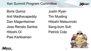 This document provides an overview of the Xen Summit agenda and Xen community updates. The first day of the Xen Summit agenda focuses on welcome presentations and case studies on using Xen Cloud Platform and XCP. It also covers topics like AMD and virtualization, energy efficient storage, and the Xen scheduler. The second day covers sessions on GoGrid, open source cloud computing, embedded workloads, and graphics passthrough challenges. It also provides an update on Xen community events and the Xen Advisory Board. Finally, it discusses the Xen Cloud Platform project and goals to create a full virtual infrastructure layer for cloud deployments.