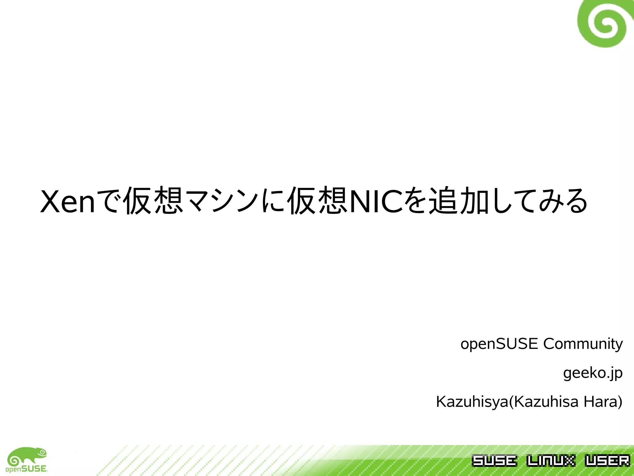 Setup Environment - ここから本題! 仮想NIC2枚挿し環境を作る • ネットワークカード2枚挿しのマシンに、同じく2個NICがある仮想マシンを構築する例です • openSUSE 10.3 , Xenは3.1系を利用 – openSUSE11.0、と言うかXen3.2系はネットワーク周りの設定が結構変わったみたい? – 同じ設定じゃ動かないかも! → 時間が出来たら検証したいと思います • 既にゲストOSがインストールされていることを前提に始めます – Sorry, 今回はインストール・ゲストOS追加は端折ります • NetworkManagerはトラブルの元 → 後記 • デモ環境はNICが一個しかないからちょっと設定が違います… – でも基本やることは一緒!