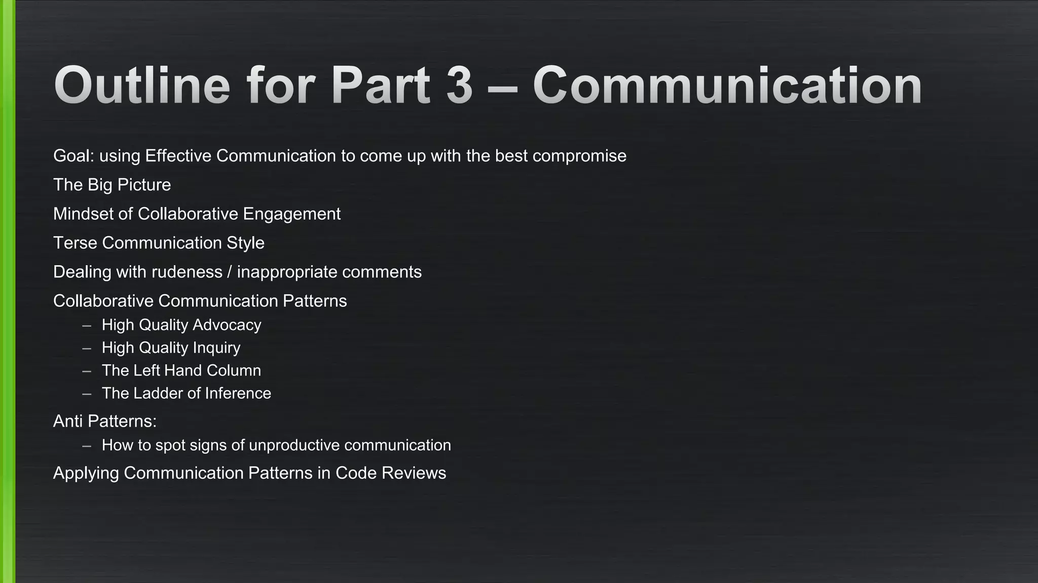 The document discusses effective communication techniques for open source projects. It covers mindsets like collaborative engagement, communication patterns like high-quality advocacy and inquiry, and anti-patterns to avoid like rudeness. It provides guidance on writing code reviews, dealing with different perspectives as a contributor versus reviewer, and handling inappropriate comments. Ladders of inference, left-hand columns, and other concepts are presented to build good communication skills.