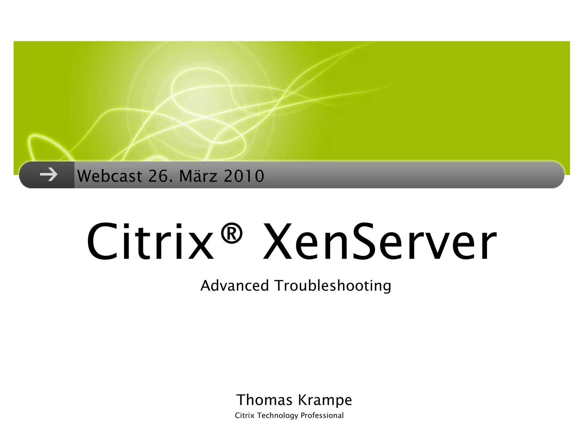 The document summarizes troubleshooting techniques for the XenServer virtualization platform. It describes the XenServer architecture including the Xen domain 0, guest OS internals, XAPI management interface, and storage manager. It then covers various troubleshooting tools and techniques such as useful Linux commands, XenServer log files, debugging XenCenter logs, and examining the object model and CLI.