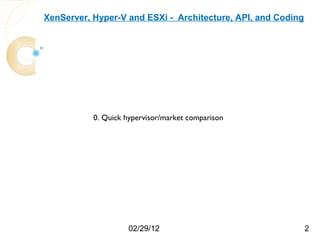 The document compares three hypervisors: XenServer, Hyper-V, and ESXi, covering aspects such as architecture, installation, and APIs. It includes personal setups for each hypervisor, networking configurations, and details about API interactions for XenServer and Hyper-V, including examples of code written to manage and monitor virtual machines. Additionally, it provides links to the full source code accessible on GitHub and personal website.