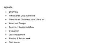 Xephon-k is a lightweight time series database (TSDB) primarily written in Go and uses Cassandra as its main backend, focusing on simplicity and performance. The document discusses its design, implementation, evaluation against other databases like InfluxDB and KairosDB, and lessons learned during development. It concludes with thoughts on the nature of time series data and future enhancements planned for the project.