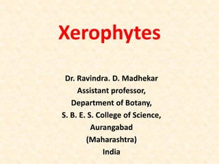 Xerophytes are plants adapted to dry environments, featuring various structural and physiological characteristics to conserve water, such as extensive root systems and modified stems and leaves. They are classified based on drought resistance, habitat, and specific adaptations, including xeromorphic and xeroplastic traits. These plants employ strategies like reduced transpiration and unique metabolic processes to thrive in extreme conditions.