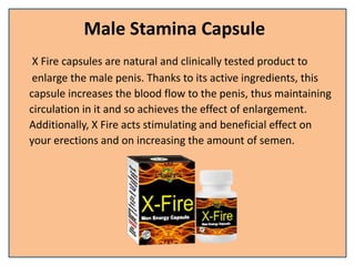 X Fire capsules are claimed to be a natural male enhancement supplement that increases blood flow to the penis to aid enlargement and support erections. It contains ingredients that boost testosterone and stimulate penis growth while enhancing sexual encounters. Men who take the supplement report noticing increased libido, sexual energy, and stronger erections within the first week. The capsules are said to provide benefits such as extra drive, strength, pleasure, and energy.