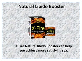 X Fire Natural Libido Booster is a supplement that claims to help users achieve more satisfying sex through improved performance, stamina, and physical powers. It contains herbs that can boost sex drive and testosterone levels while helping with premature ejaculation. The formula is said to enhance pleasure, orgasms, and support overall well-being without side effects. Thousands of customers report being satisfied with increased sexual stamina and testosterone levels from using this product.