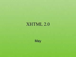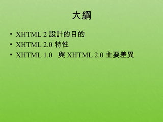 本文件讨论了xhtml 2.0的设计目的与特性,以及与xhtml 1.0的主要区别。xhtml 2.0旨在提高通用性、结构性和国际化,同时需要更少的脚本。文档还介绍了xhtml 2的模块,包括角色、rdfa语法和xforms等。