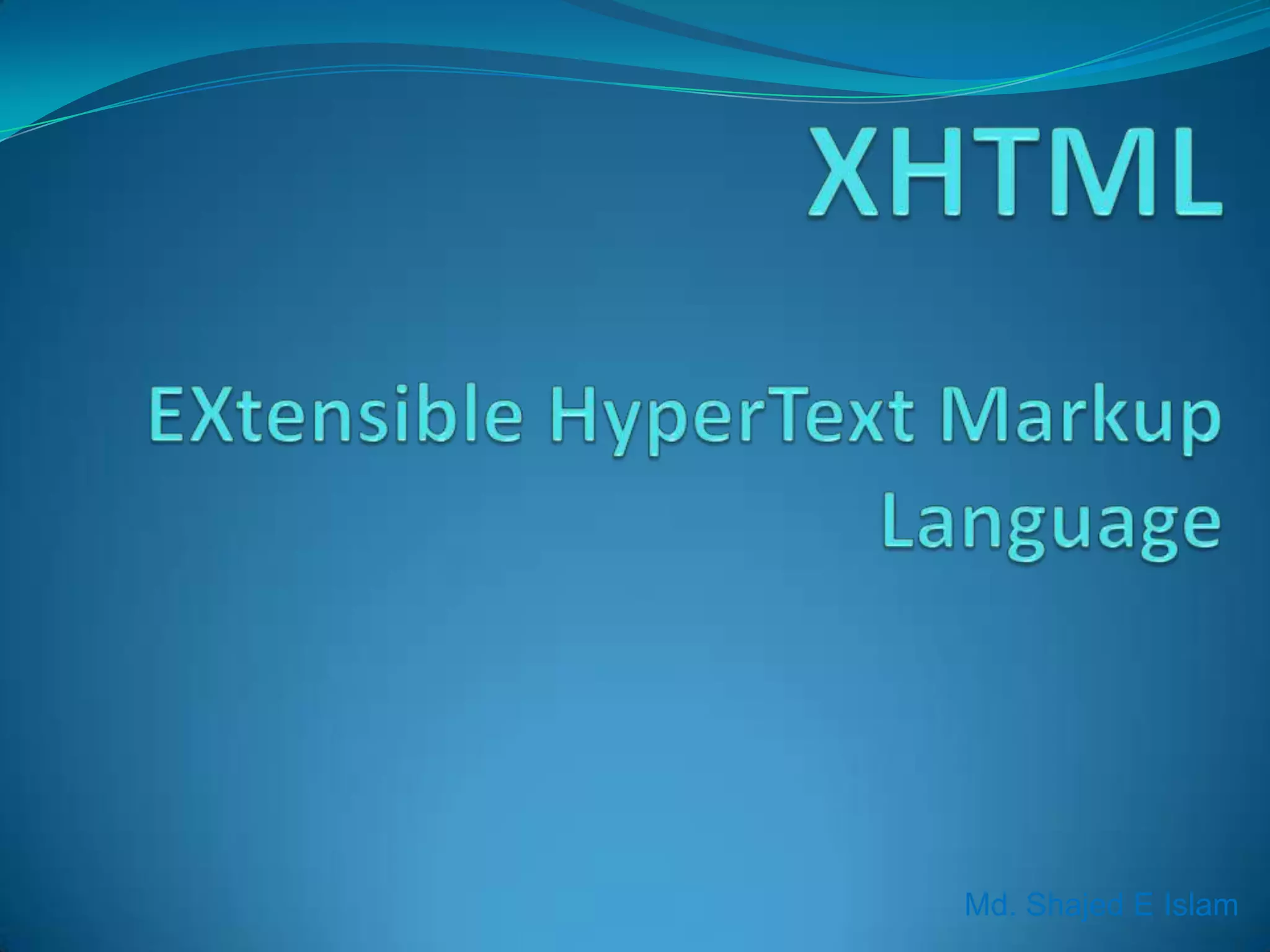 XHTML is a stricter version of HTML that incorporates XML syntax rules. It is almost identical to HTML but requires proper nesting of elements, closing of all elements, and lowercasing of all element names. XHTML documents must also have one root element and include an XML declaration. Following these XML rules makes XHTML documents more compatible with other devices and browsers than regular HTML documents.