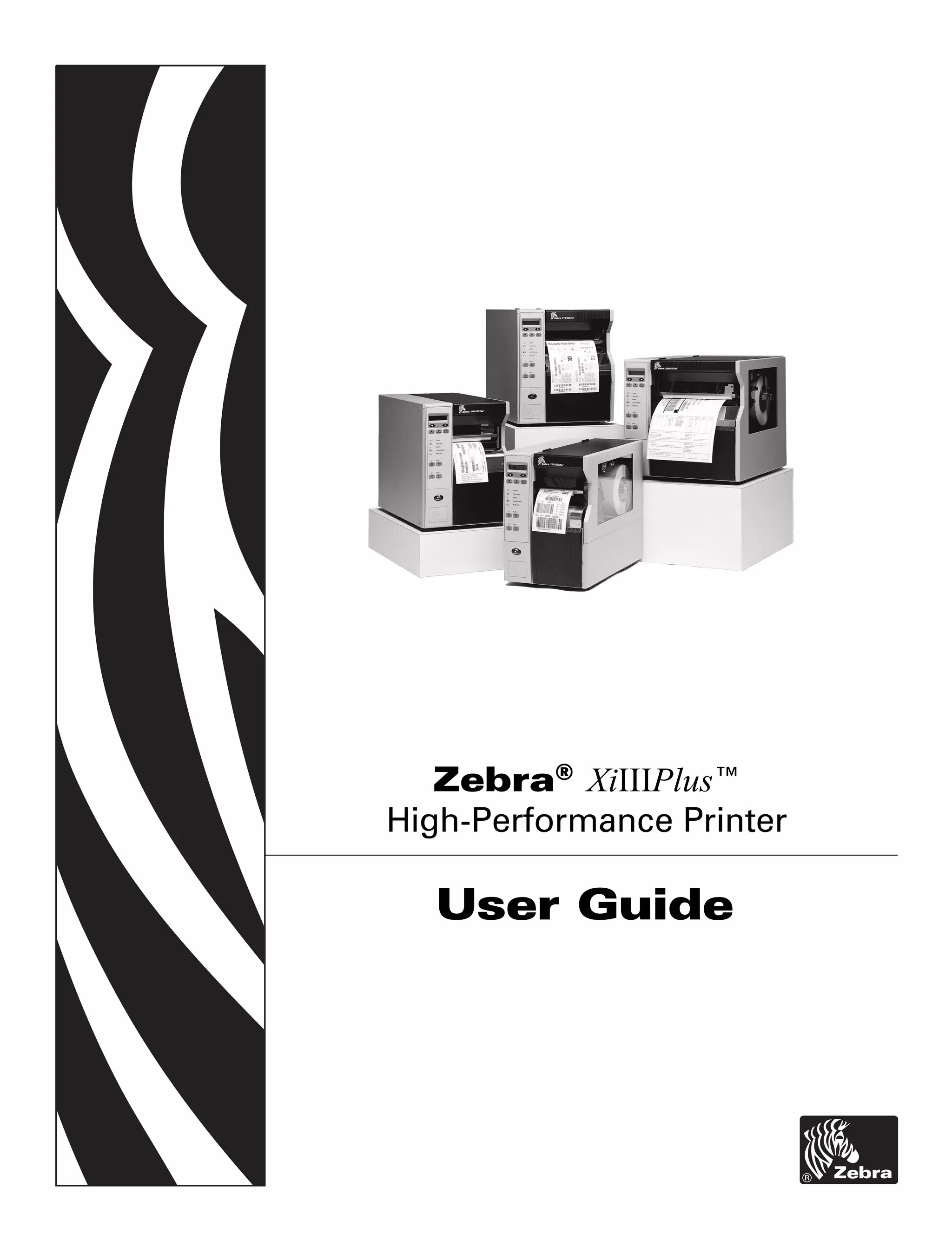 The document is a user guide for the Zebra XiIIIPlus series of high-performance printers. It contains information about setting up the printer, loading media and ribbon, operating the printer, and print modes and options. The guide includes sections on unpacking and inspecting the printer, selecting a site and power source, connecting data and communication interfaces, calibrating sensors, and adjusting printhead pressure and toggle position. It provides instructions and specifications to properly set up and operate the XiIIIPlus printers.