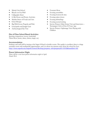 The document summarizes a proposed trip for Year 7 students from CIS to visit Xi'an, China. Xi'an has over 3,000 years of history and was the capital city for several dynasties. During the 12-day trip in May, students will experience Xi'an's cultural sites while immersed in language classes and traditional activities. Their daily schedule includes in-school classes in subjects like Chinese, arts, and sports, as well as outings to locations around Xi'an. Students will stay in a hotel near their partner school.