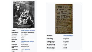 Moll Flanders by Daniel Defoe tells the story of a woman born into poverty who struggles throughout her life, while Dangerous Liaisons by Choderlos De Laclos depicts the licentious activities of French aristocrats in the late 18th century. The two novels differ in that Dangerous Liaisons uses a epistolary format through letters between characters, whereas Moll Flanders is written in prose style as a story.