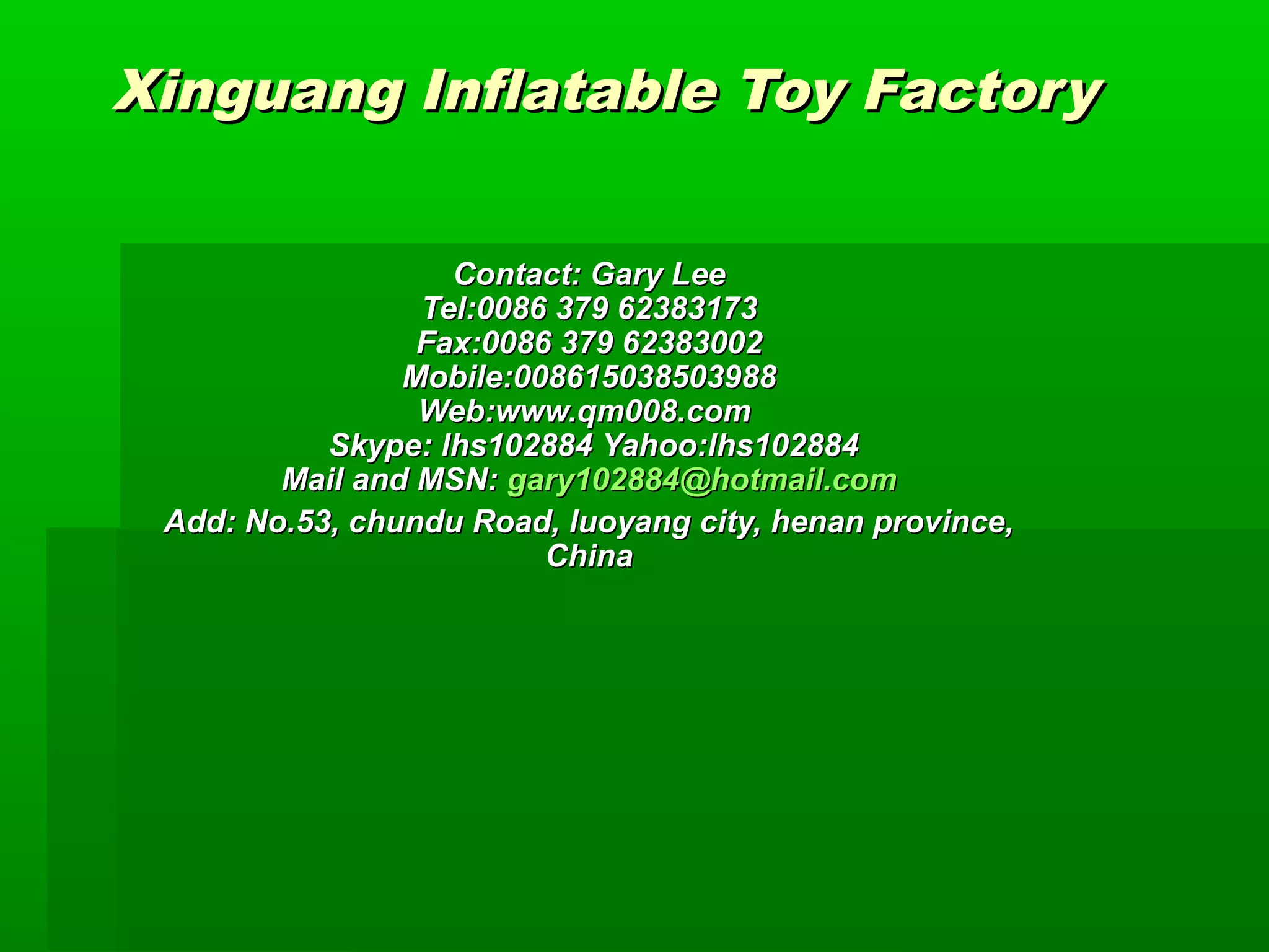 Xinguang Inflatable Toy Factory is located in Luoyang City, Henan Province, China and specializes in producing inflatable toys for over 11 years. They provide a wide range of inflatable designs and are looking for business cooperation to export their products. Potential partners can become a sole or general agent and Xinguang offers production of custom designs, printing of logos, quick delivery, product information and maintenance support.