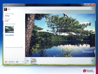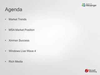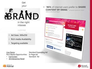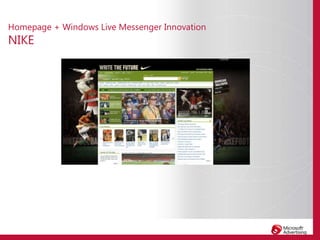 This document summarizes Microsoft's digital advertising opportunities across its portfolio of properties including MSN portal, Windows Live services like Hotmail and Messenger, and the Microsoft Media Network. It highlights how advertisers can reach large audiences across Microsoft's properties, use innovative rich media formats to boost engagement, and target users along their consumer decision journey from initial awareness to purchase. Case studies show how brands like Sony, KFC, and Nike have successfully used Microsoft's properties and advertising solutions to increase their brand awareness, engagement, and reach among digital audiences.
