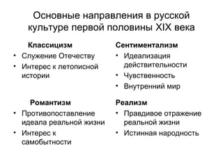 Девятнадцатый век считается 'золотым' веком русской культуры из-за процветания литературы, живописи, архитектуры и музыки. Основные направления включают классицизм, сентиментализм, романтизм и реализм, с выдающимися деятелями, такими как Пушкин и Глинка, которые способствовали созданию русского национального языка и музыкальной школы. Культурные достижения этого периода сформировали уникальный кодекс русской национальной идентичности и обогатили мировую культурную историю.