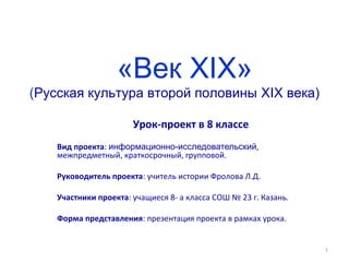 Проект для восьмиклассников посвящен изучению русской культуры второй половины XIX века и включает в себя элементы живописи, литературы, архитектуры и музыки. Учащиеся работают над сбором материалов, их анализом и представлением результатов в виде презентаций, что способствует развитию исследовательских и коммуникативных навыков. Реализация проекта позволяет ученикам глубже погрузиться в исторический контекст и улучшить свою учебную деятельность, что актуализирует их знания по предмету.