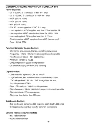 The document provides information about the Model XK-550 Digital/Analog Trainer: