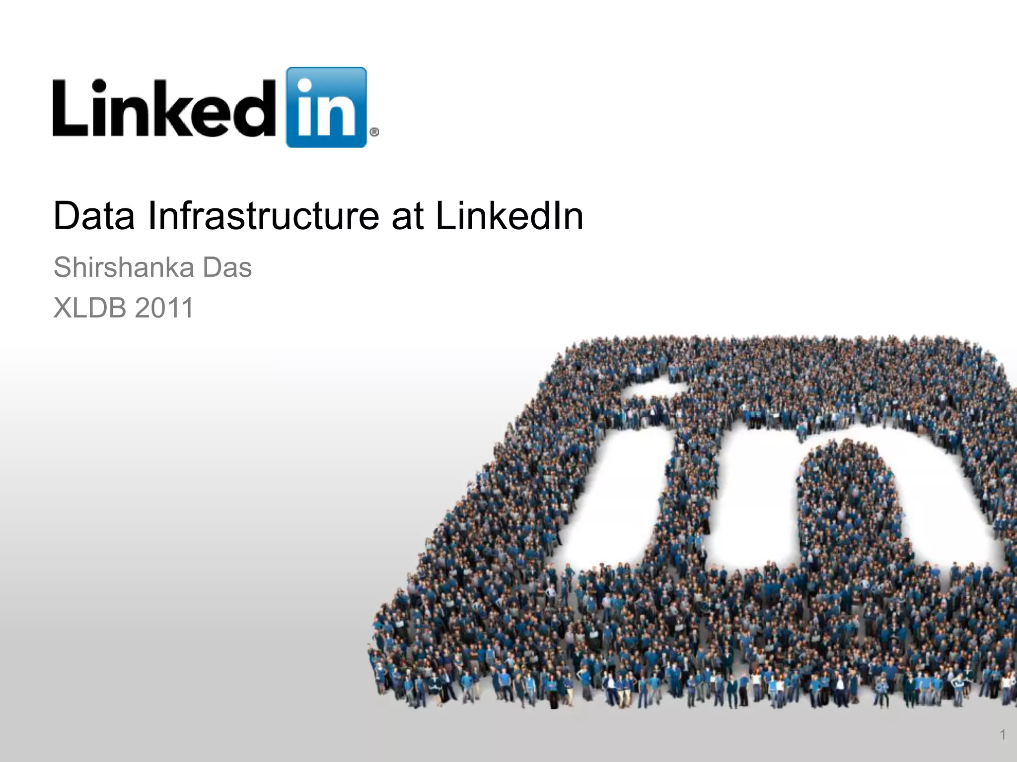 This document discusses LinkedIn's data infrastructure. It describes how LinkedIn handles large volumes of user data across online, nearline and offline systems. Key systems discussed include Kafka for messaging, Databus for change data capture, Voldemort for online key-value storage, and Espresso for indexed, timeline-consistent distributed storage. Espresso provides a rich data model and APIs for applications to access user data.