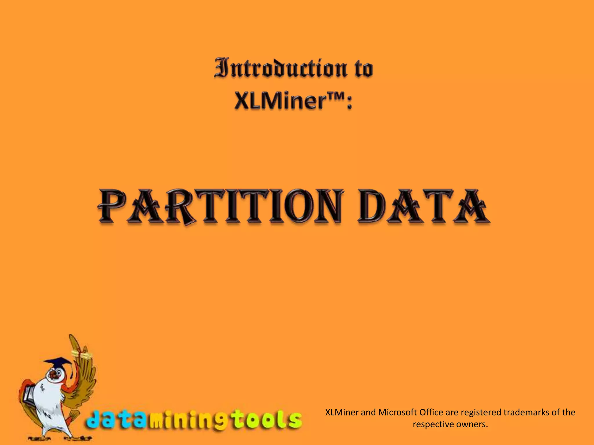 This document introduces data partitioning in XLMiner. Partitioning divides a large dataset into training, validation, and test sets. The training set builds a model, the validation set checks the model's accuracy, and the test set determines real-world performance. XLMiner allows standard partitioning with random assignment or specifying percentages, as well as oversampling to balance low-success outputs.