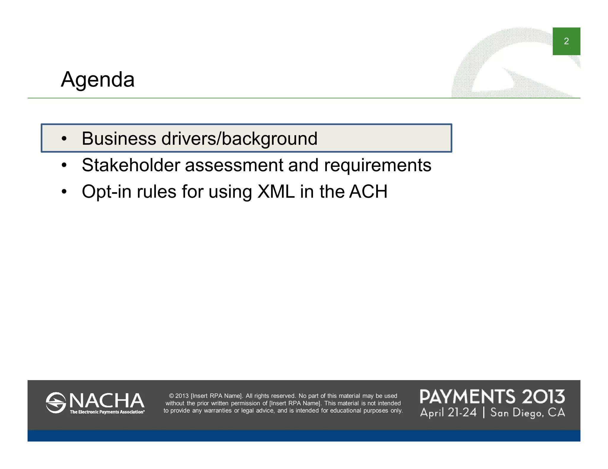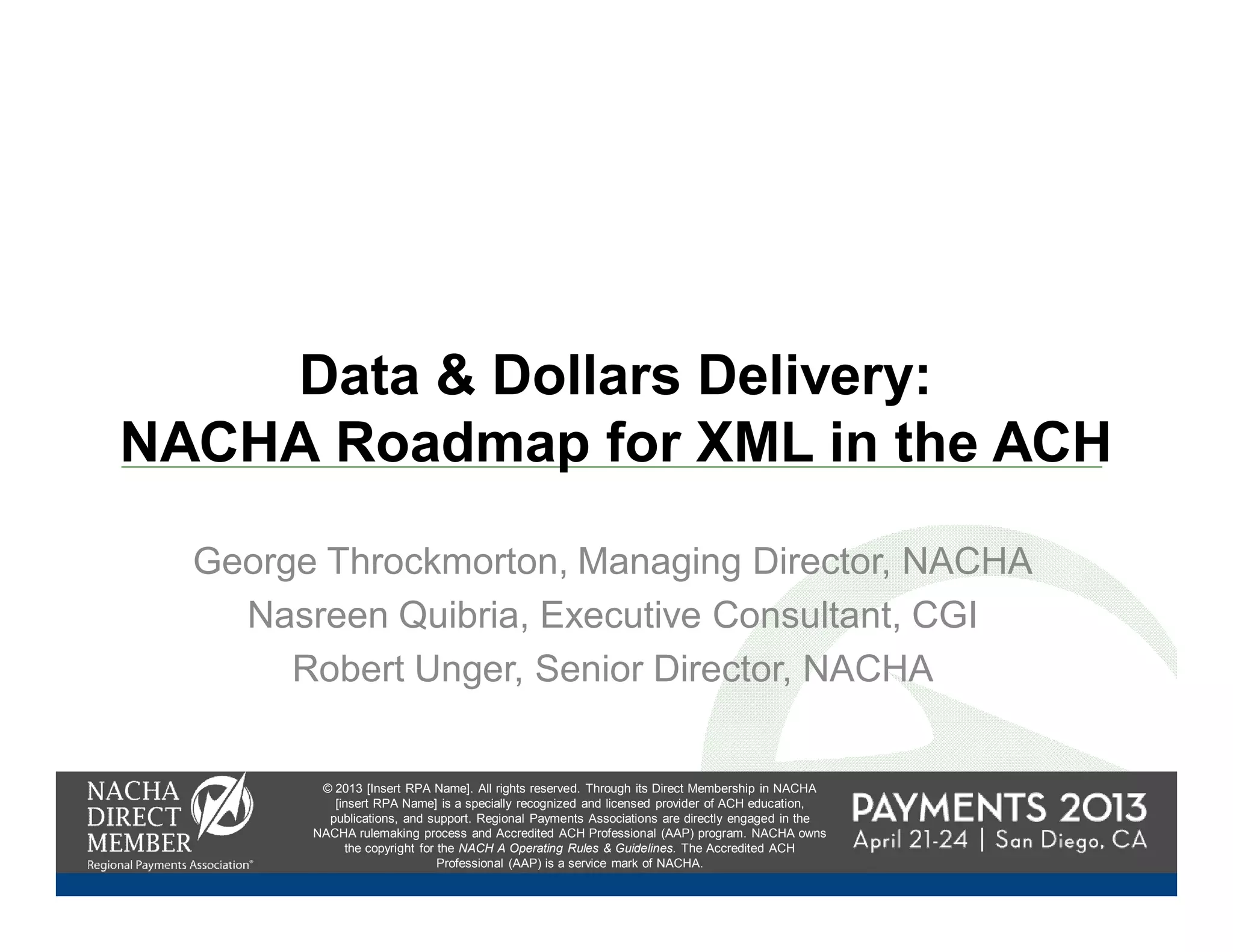 The document outlines the development and promotion of XML formatted remittance data in ACH payments by nacha. It discusses the challenges and opportunities in integrating XML for B2B transactions, highlighting the need for harmonization in payment systems and detailing the phased strategy for implementing XML standards. Emphasis is placed on stakeholder assessment, opt-in participation, and the potential for increased efficiency in remittance processes.