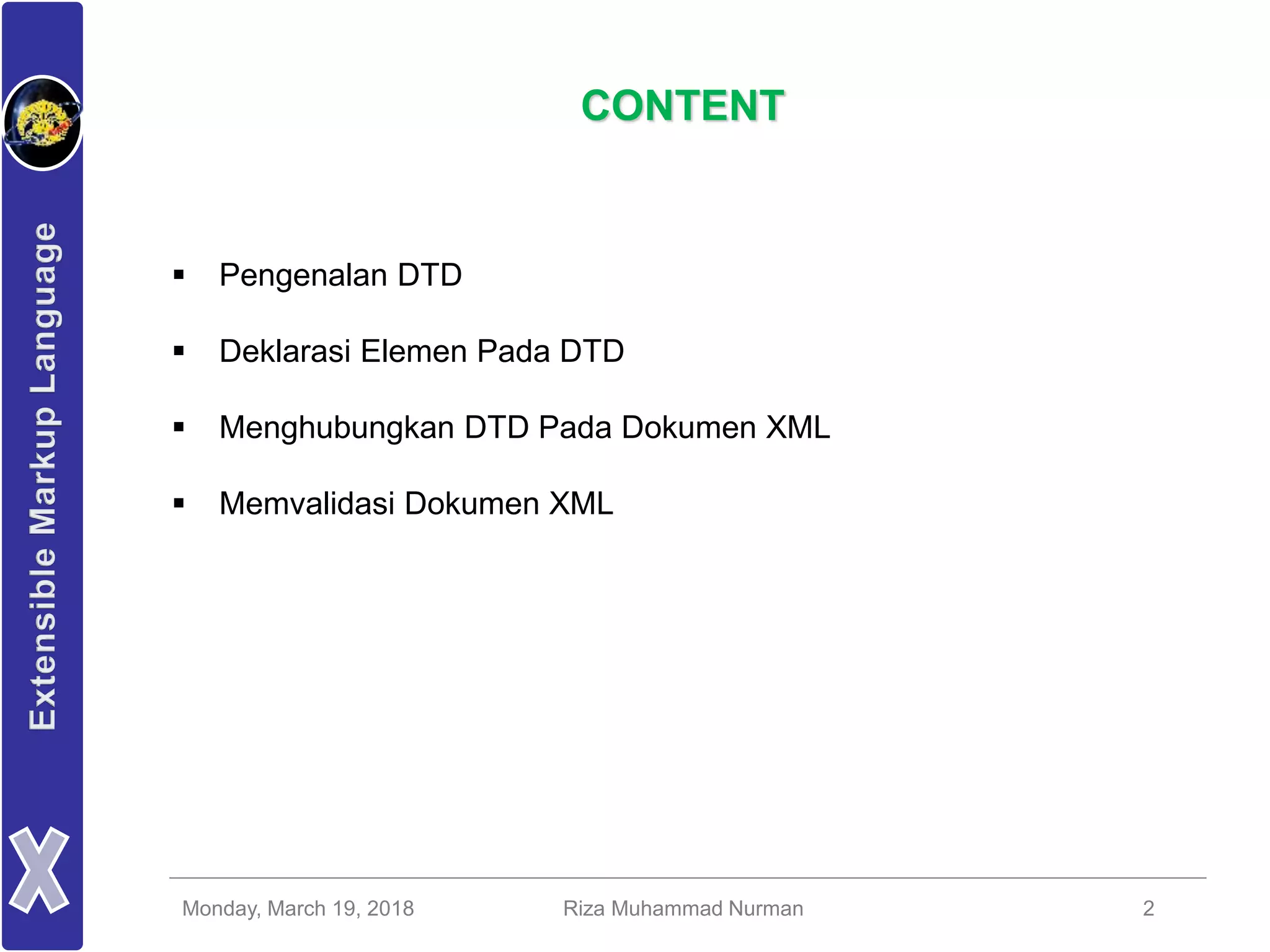 Dokumen tersebut membahas tentang penggunaan DTD (Document Type Definition) untuk menentukan struktur dan konsistensi data pada dokumen XML, meliputi pengenalan DTD, deklarasi elemen dan atribut, serta validasi dokumen XML menggunakan DTD."