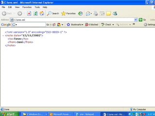 XML is a markup language used to describe data. It was designed to focus on what data is, rather than how it looks like HTML. XML uses element tags to structure and store information. Elements must be properly nested, have closing tags, and follow other syntax rules. XML can be used to exchange data between systems, store data in files or databases, and make data available in different formats.