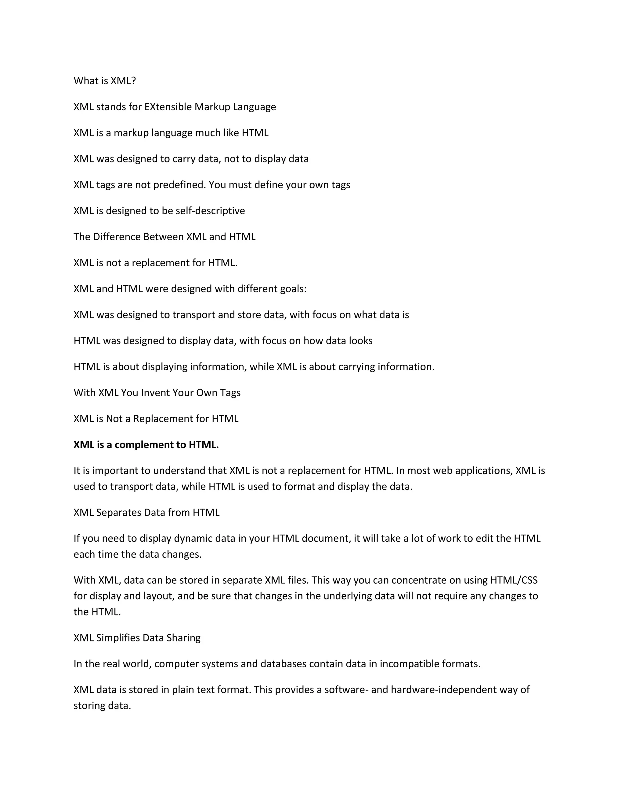 XML stands for Extensible Markup Language. It is used to carry data, not display it like HTML. XML tags are defined by the developer rather than being predefined. XML documents form a tree structure with elements having parent-child relationships. Namespaces are used to avoid conflicts when element names are reused, and default namespaces simplify markup by eliminating the need for prefixes on child elements.