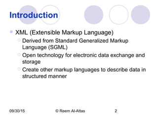 This document provides an introduction to XML (Extensible Markup Language). XML is derived from SGML and allows users to create structured data formats and share information. The document discusses XML documents, parsers, and document type definitions (DTDs). It also introduces XML schemas, namespaces, and common XML vocabularies used to describe different types of data like math expressions and vector graphics.