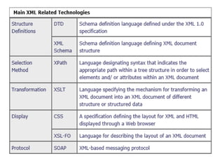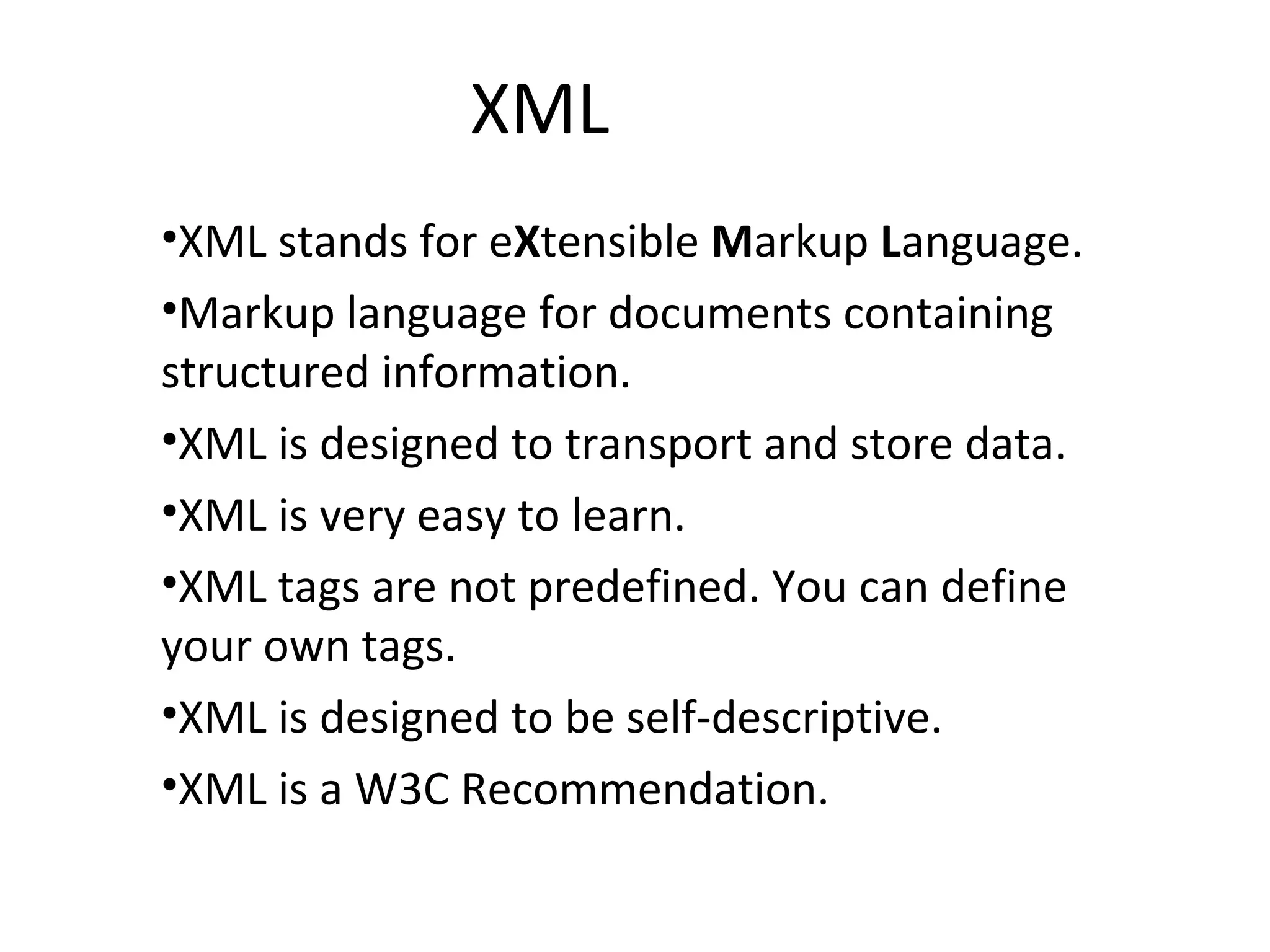 XML stands for eXtensible Markup Language. It is used to store and transport structured data. XML allows users to define their own tags for marking up data with a tree structure, with one root element. Key features of XML include being extensible, using markup tags, and describing data in a human- and computer-friendly format. XML is commonly used for transporting data between systems and long-term storage of structured data.