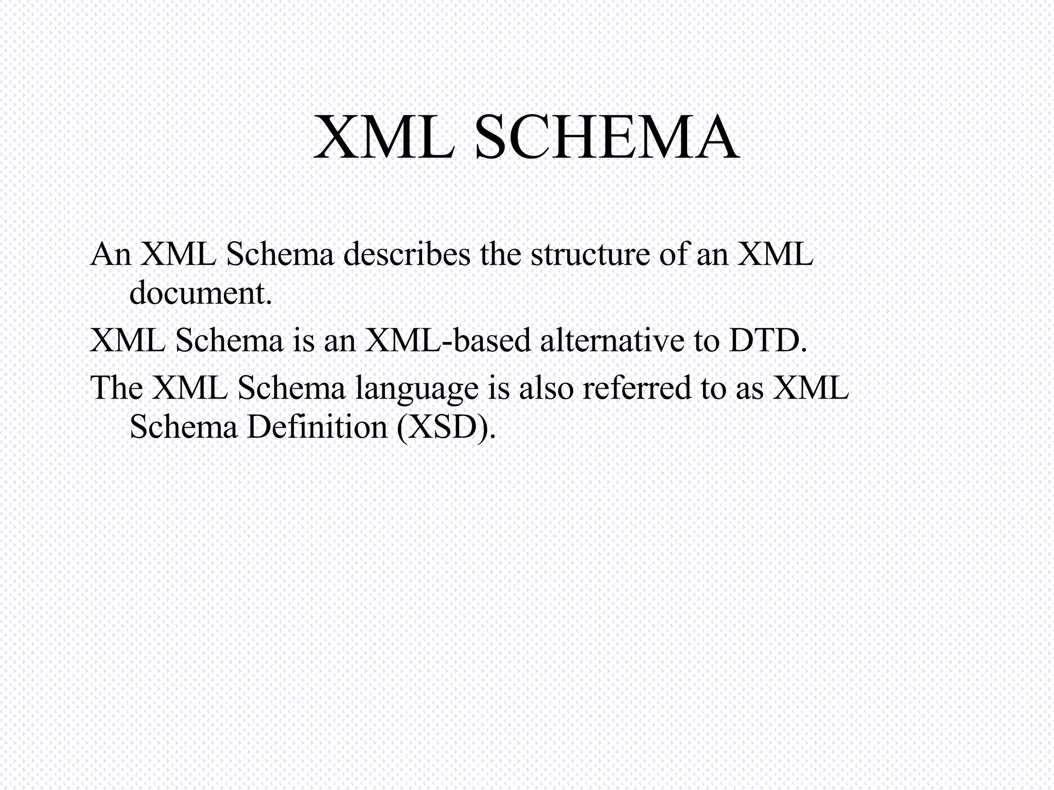 An XML schema defines the structure and elements of an XML document. It is an XML-based alternative to DTDs that allows defining element types, attributes, data types, defaults and restrictions. Schemas support namespaces, data types, extensibility and are written in XML, allowing the use of XML tools. Complex elements can contain child elements, text or both.