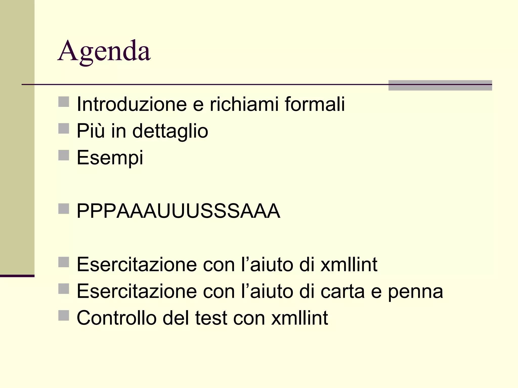 Il documento descrive l'uso degli XML Schema per la validazione di documenti XML, fornendo informazioni dettagliate su come definire tipi di dati, dichiarare elementi e gestire le occorrenze. Vengono presentati vari tipi di schema e specifiche tecniche per garantire la conformità dei documenti rispetto agli schemi richiesti. Include anche esercitazioni pratiche per l'applicazione delle nozioni apprese.