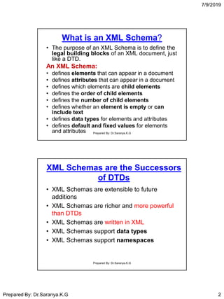The document discusses XML schemas and their advantages over DTDs. It explains that XML schemas describe the structure of an XML document, are written in XML syntax, and support data types. The document provides examples of simple and complex element definitions in an XML schema, as well as examples of XML documents referencing a DTD and XML schema.