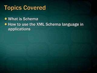 The document describes XML Schema, including what it is, how it defines the structure of an XML document, and how it compares to DTDs. Specifically: