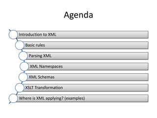 This document provides an overview and introduction to XML (eXtensible Markup Language). It discusses the basic rules of XML, parsing XML, XML namespaces, XML schemas, XSLT transformations, and examples of where XML is applied such as web design, web services, mobile web, and content authoring.