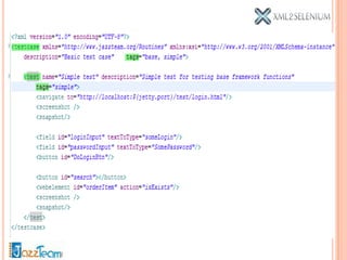 Документ рассматривает проблему автоматизации тестирования на примере продукта xml2selenium, подчеркивая недостаточные инвестиции многих компаний в QA-инженеров на фоне увеличения сложности и количества use cases. Основные проблемы включают поддержку тестирования на различных инсталяциях, управление версиями продукта и необходимость возможности изменений в тестах. Также обсуждаются аспекты структуры теста, использования инструментов и интеграции с другими системами.