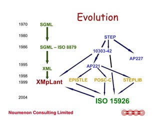 XMpLant is a technology for implementing ISO 15926 that uses a generic high-level plant item object classified according to ISO 15926-4. It supports the full engineering model and has interfaces to many plant design systems. XMpLant has been deployed in over 40 major projects, proving that ISO 15926 can deliver business benefits today by enabling interoperability through flexible modeling and rule-based mapping.