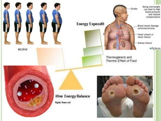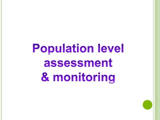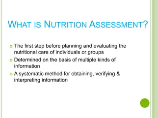 The document discusses nutrition assessment, which is the first step in planning and evaluating nutritional care. Nutrition assessment involves obtaining and interpreting multiple types of information, including anthropometrics, biochemistry, clinical factors, and dietary intake. Anthropometrics measures body size, shape, and composition using tools like BMI, waist circumference, and skin fold thickness. Biochemistry involves analyzing blood, urine, tissues, and functional tests. Clinical assessment obtains medical history and examines signs and symptoms. Dietary intake methods measure usual food and nutrient consumption. Together, this comprehensive assessment identifies nutritional risks and needs.