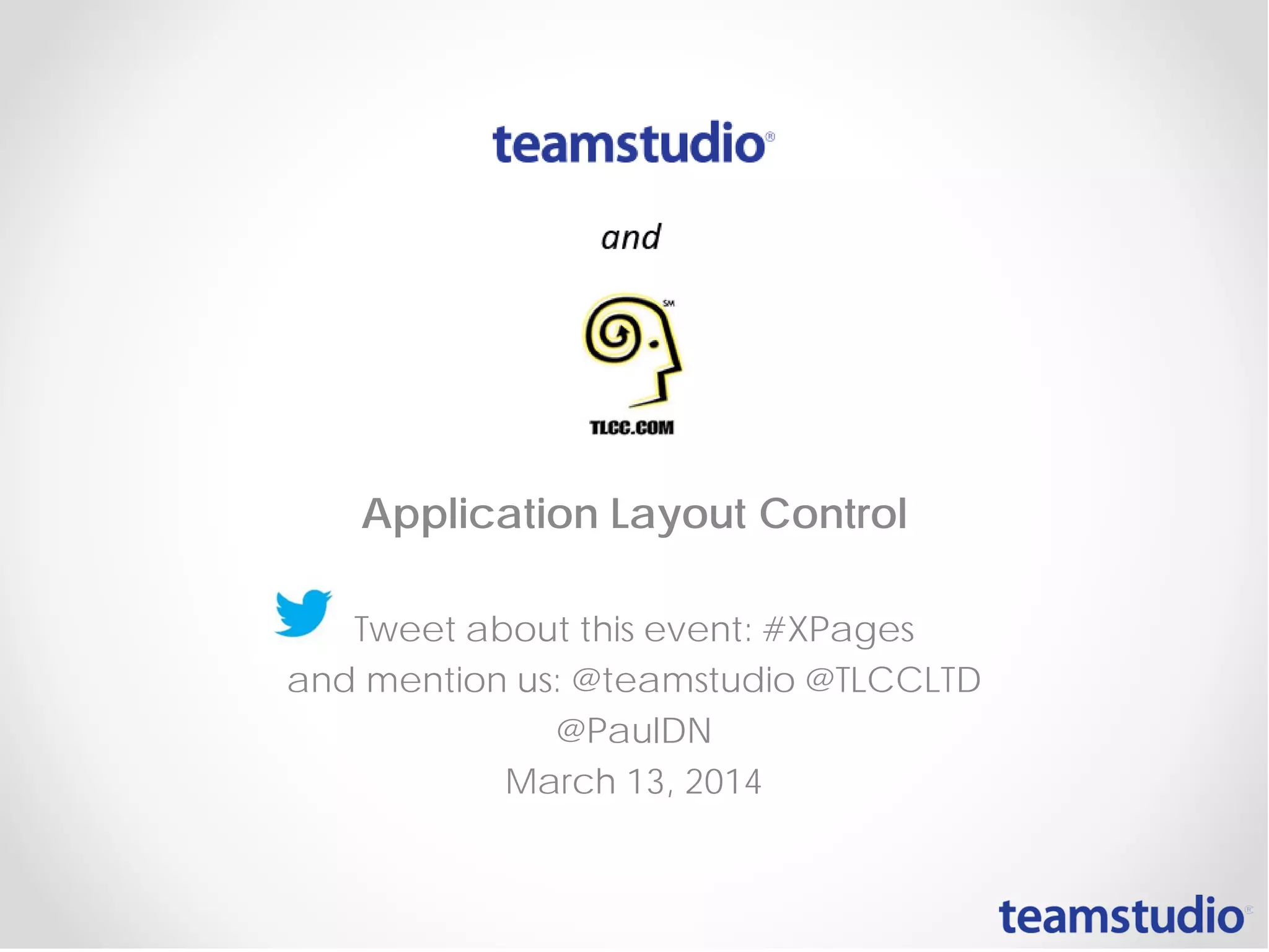 The document outlines information about Teamstudio's tools for collaborating in IBM Notes and their mobile product, Unplugged, which allows offline access to Notes applications. It discusses upcoming webinars and events, including rapid XPages development sessions and Engage conference details. Additionally, it covers the application layout control framework for developing consistent user interfaces within the XPages environment.