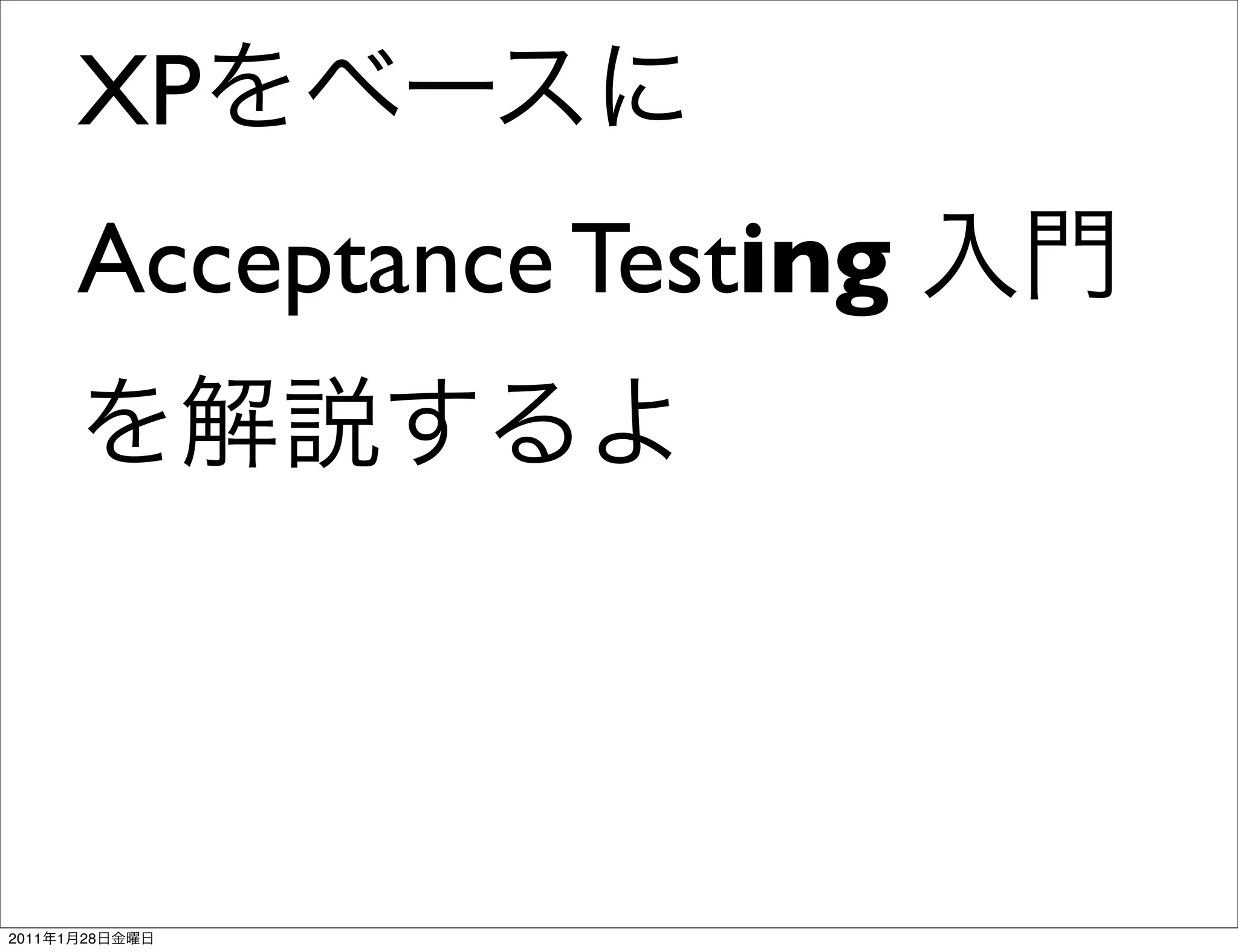 The document discusses Extreme Programming (XP) and acceptance testing techniques like customer tests, behavior driven development (BDD), and Fit. It explains how these practices emphasize collaboration between customers, developers and testers to ensure software meets requirements through conversation and executable specifications using examples with formats like Given, When, Then.
