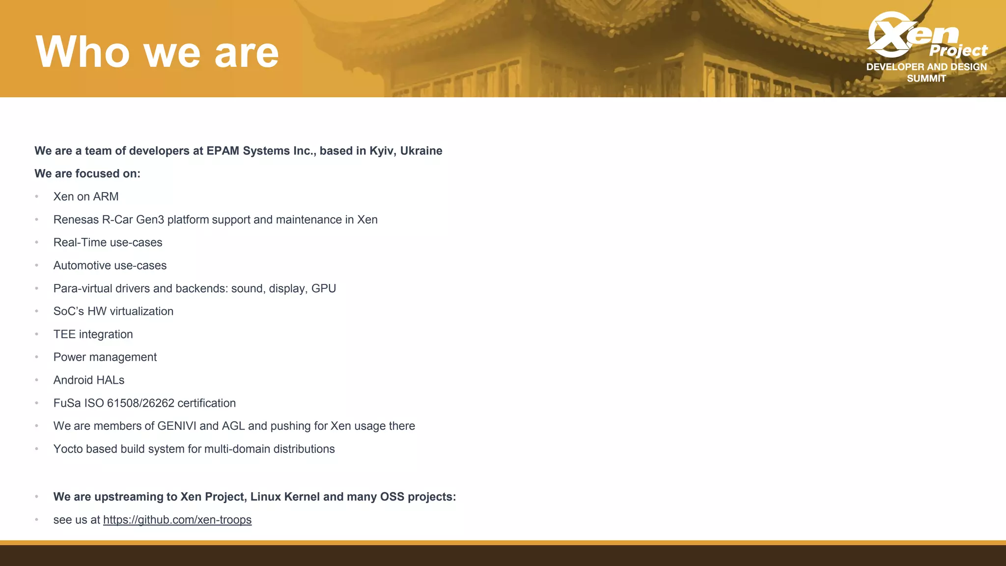 The document discusses the implementation of the Xen hypervisor on ARM architecture for real-time and automotive use cases by EPAM Systems in Ukraine. It outlines the challenges of ensuring real-time performance in virtualized environments, detailing the evaluation of different scheduling methods and configurations for managing critical tasks. The findings emphasize the importance of dedicated CPU pools for isolation and the potential of the RTDS scheduler for resource efficiency, while also identifying areas for future improvements in scheduling time accounting.