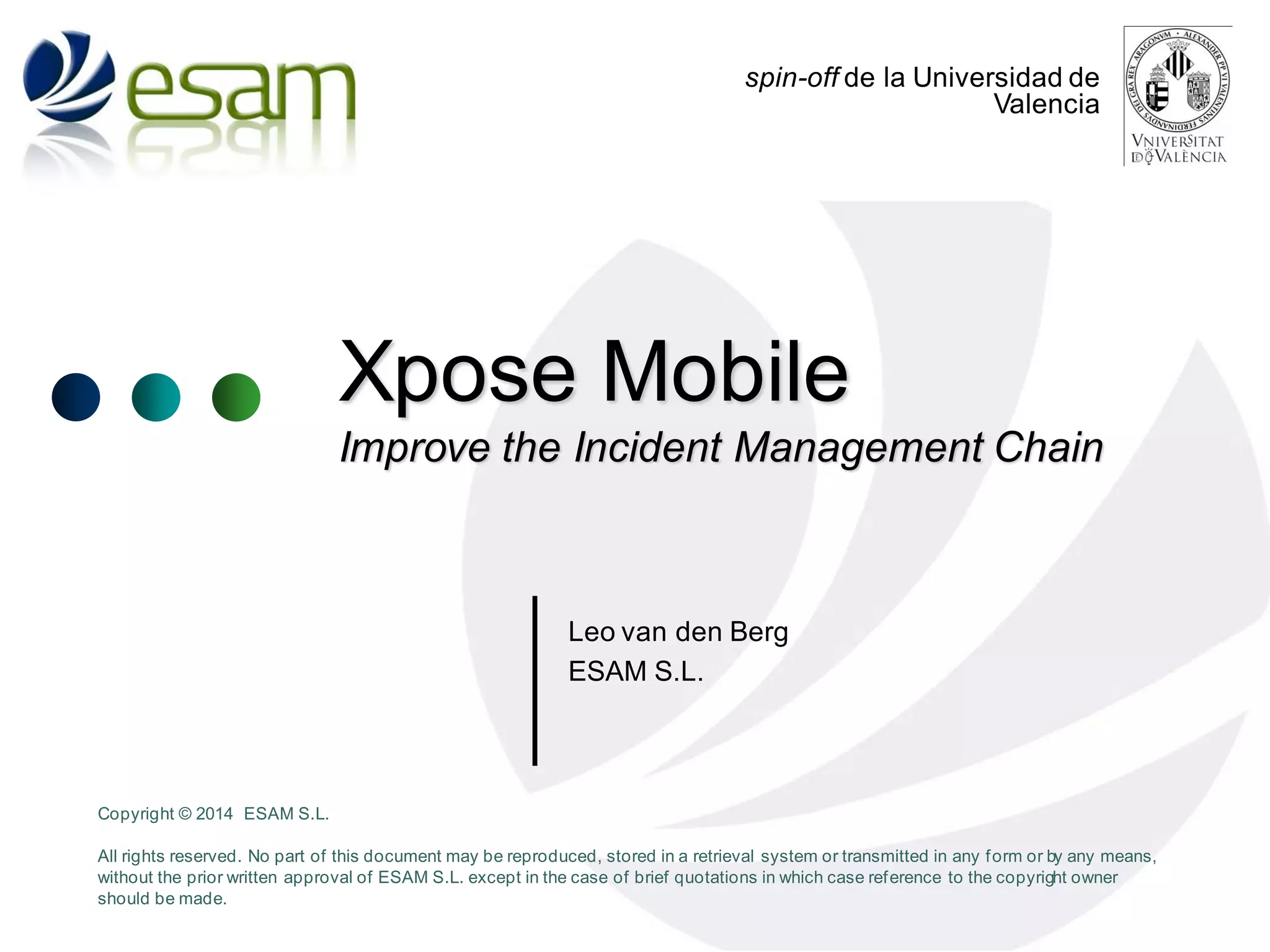 The document discusses improving incident management through mobile applications that integrate with the Xpose platform. It describes how Xpose provides a common data model and services to allow exchange of information between organizations. It then outlines several mobile applications for incident notification, chat, and damage registration that provide live interaction between operators and roadside assistance during an incident. These applications are fully integrated with the Xpose platform and incident management system. Finally, it notes that the Xpose core software is available as open source and their platform will support additional incident management services.