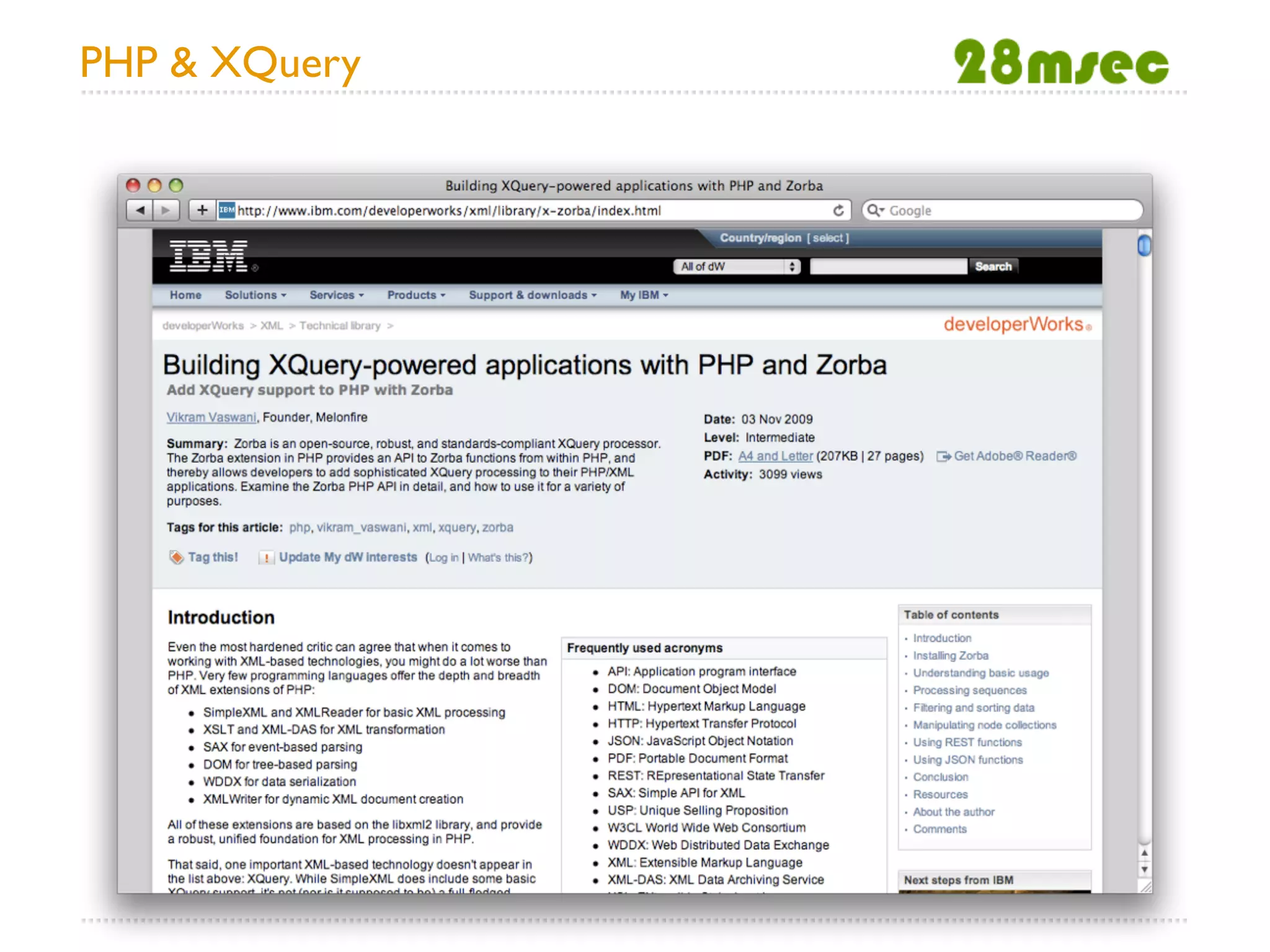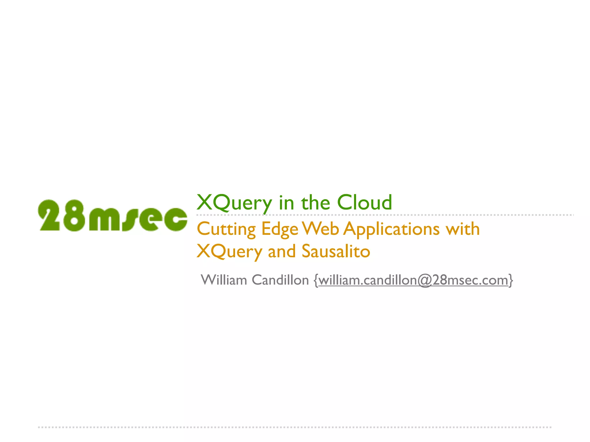 This document discusses XQuery and how it can be used for web applications. It addresses some common misconceptions about XQuery, such as that it is not a scripting language, has no application server, lacks open source tools, and has no utility functions for the web. It then introduces Sausalito, an open source XQuery application server, and describes some of its features like the AtomPub module and utility functions across many modules that enable building web applications with XQuery in the cloud.