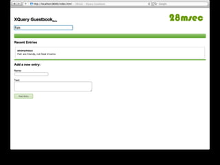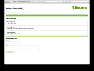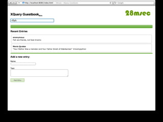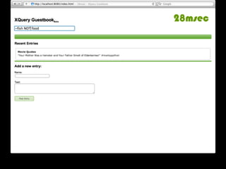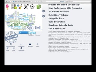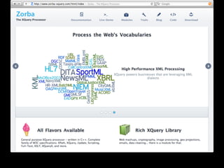 This document contains snippets of code from different programming languages and data formats including XQuery, JSON, XML, and SQL. It demonstrates how XQuery can be used for tasks like querying data, updating databases, interacting with web services, and integrating with other languages and technologies like JavaScript, HTML, Java, and SQL. Key advantages of XQuery highlighted include its powerful and flexible data model, its ability to seamlessly invoke other languages and technologies, and its potential for high performance and productivity.