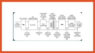 The document discusses the components and functioning of an x-ray generator. An x-ray generator uses a step-up transformer to increase the voltage supplied to the x-ray tube and a rectifier to convert the alternating current to direct current for powering the tube. Different types of generators are used including single phase, three phase with 6 or 12 pulses, and high frequency generators which further smooth the pulsating direct current.