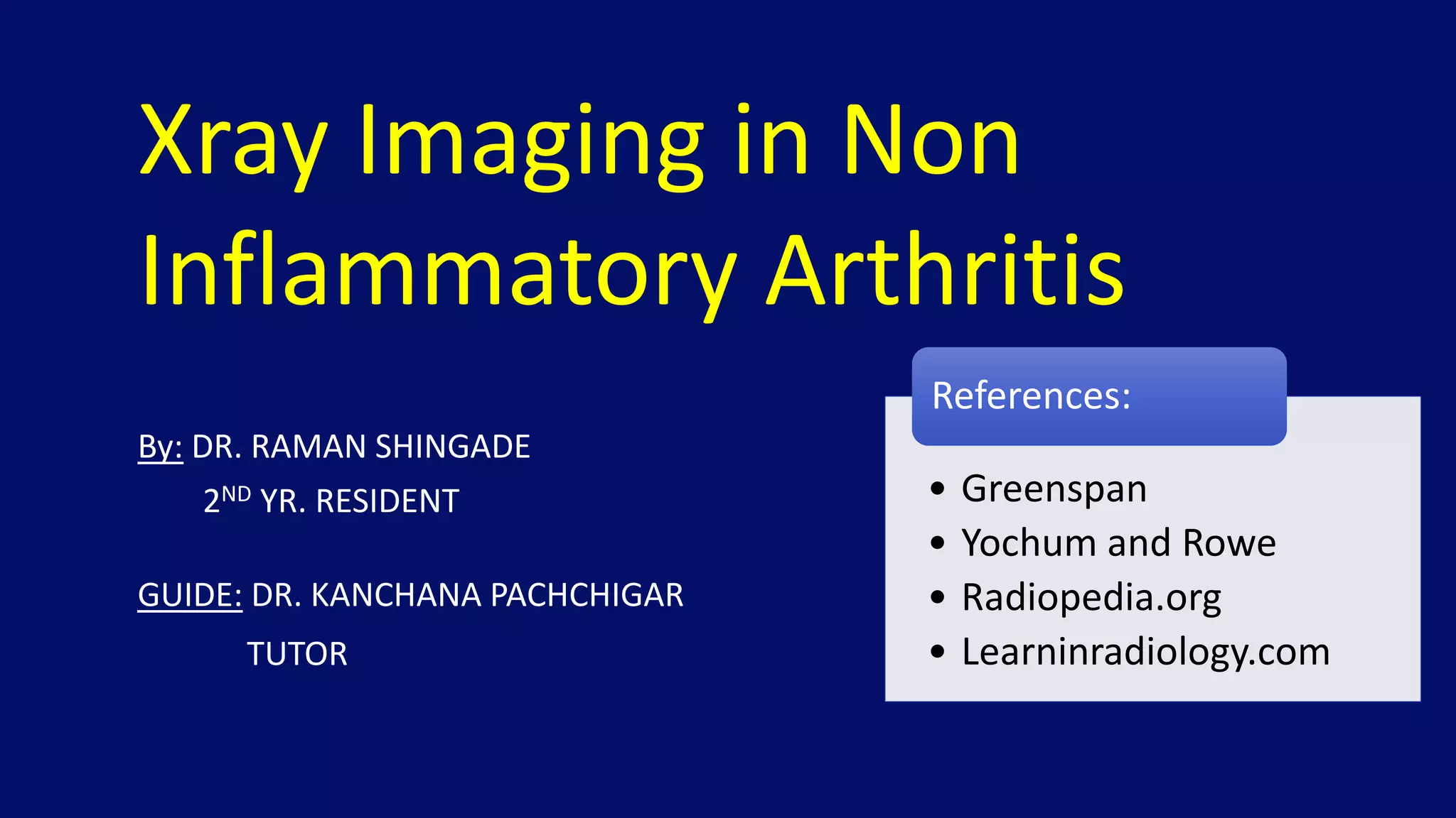 The document provides an overview of non-inflammatory arthritis, including the different types and their radiographic manifestations. It discusses osteoarthritis and its primary and secondary causes. Key features described include joint space narrowing, osteophytes, subchondral sclerosis for osteoarthritis. Neuropathic arthritis is characterized by the 6 D's. Osteonecrosis shows a radiolucent crescent sign and preserved joint space. Connective tissue diseases like scleroderma and mixed connective tissue disease demonstrate characteristic bone changes and calcifications. Metabolic disorders such as acromegaly, hemochromatosis, hyperparathyroidism, and gout each have distinct radiographic findings discussed in the summary.