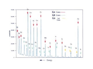 2. X-ray fluorescence analysis uses x-rays to excite elements and analyze chemical compositions with parts-per-million sensitivity but limited spatial resolution. Electron microprobes use focused electron beams for higher 1-micron spatial resolution but lower detection limits of 0.01%.