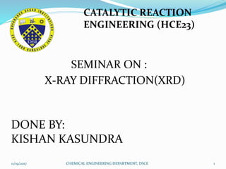 The document summarizes a seminar on X-ray diffraction (XRD) techniques. It introduces Bragg's law which relates the wavelength of X-rays to the diffraction pattern produced when X-rays interact with a crystal lattice. Three common XRD methods are described: the Laue method for single crystals, the rotating crystal method, and the powder method. Applications of XRD include determining crystal structures of minerals, metals, and biological molecules. Limitations are that it has a detection limit of 2% for mixed materials and peak overlap issues.