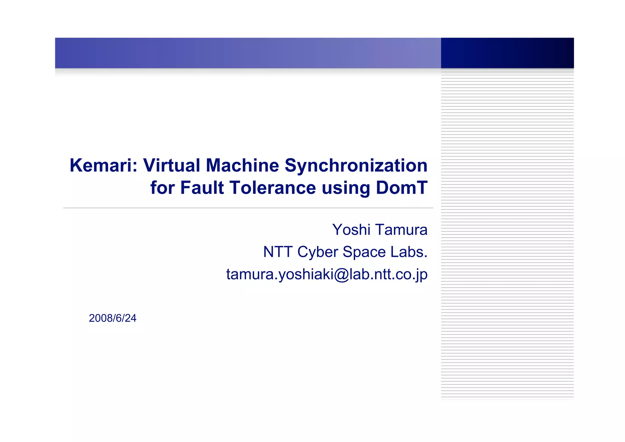 Kemari is a virtual machine synchronization technique that allows fault tolerance by keeping a primary and secondary VM identical. It uses DomT, a para-virtualized domain, to efficiently synchronize state between VMs by tapping event channels and only transferring updated memory pages. Evaluation shows the secondary VM can continue transparently and with acceptable performance during network, storage and file I/O workloads when the primary hardware fails.