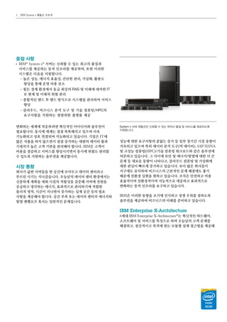 ์ ํ๊ตฐ ๋ธ๋ก์ 2 ์ค์ ์ฌํญ โโ โ โ IBMยฎ System xยฎ ์๋ฒ๋ ์ ๋ขฐํ ์ ์๋ ์ต๊ณ ์ ํ์ง๊ณผ ์๋น์ค๋ฅผ ์ ๊ณตํ๋ ๋์ ์ธํ๋ผ๋ฅผ ์ ๊ณตํ๋ฉฐ, ๋ํ ์ด๋ฌํ ์์คํ ์ ๋ค์์ ์ง์ํฉ๋๋ค. โ ๋์ ์ฑ๋ฅ, ์๋์ง ํจ์จ์ฑ, ๊ฐ๋จํ ๊ด๋ฆฌ, ๊ฐ์ํ, ํ์ฉ๋ ํฅ์์ ํตํด ์ด์ ๋น์ฉ ๊ฐ์ โ ํ๋ ๊ฒฝ์ ํ๊ฒฝ์์ ๋๊ธ ์ต๊ฐ์ RAS ๋ฐ ๋ฏธ๋์ ๋๋นํ IT ๋ก ํ์ฌ ๋ฐ ๋ฏธ๋์ ์ํ ๊ด๋ฆฌ โ ์ข ํฉ์ ์ธ ์๋ ํฌ ์๋ ๋ฐฉ์์ผ๋ก ์์คํ ์ ๊ด๋ฆฌํ์ฌ ์๋น์ค ํฅ์ โ ํด๋ผ์ฐ๋, ๋น์ฆ๋์ค ๋ถ์ ๋๊ตฌ ๋ฐ ๊ธฐ์ ์ปดํจํ /HPC์ ์๊ตฌ์ฌํญ์ ์ง์ํ๋ ๊ด๋ฒ์ํ ํ๋ซํผ ์ ๊ณต ๋ณํํ๋ ์ธ๊ณ์ ์ ์ํ๋ ค๋ฉด ํ์ ์ ์ธ ์์ด๋์ด์ ์๋ฃจ์ ์ด ํ์ํฉ๋๋ค. ๋์์ ์ธ๊ณ๋ ์ ์ ๋๋ํด์ง๊ณ ์์ผ๋ฉฐ ๋์ฑ ๊ธฐ๋ฅํ๋๊ณ ์ํธ ์ฐ๊ฒฐ๋๋ฉฐ ์ง๋ฅํ๋๊ณ ์์ต๋๋ค. ๊ธฐ์ ์ IT์ ๋ง์ ์ง์ถ์ ํ์ง ์์ผ๋ฉด์ ์ ์ ์ฆ๊ฐํ๋ ๋๋์ ๋ฐ์ดํฐ ํ๊ณผ ๊ธฐ๋์น๊ฐ ๋์ ๊ณ ๊ฐ ๊ธฐ๋ฐ์ ๊ด๋ฆฌํด์ผ ํฉ๋๋ค. IBM์ ๊ณ ๊ฐ์ด ๋น์ฉ์ ์ ๊ฐํ๊ณ ์๋น์ค๋ฅผ ํฅ์์ํค๋ฉด์ ๋์์ ์ํ๋ ๊ด๋ฆฌํ ์ ์๋๋ก ์ง์ํ๋ ์๋ฃจ์ ์ ์ ๊ณตํฉ๋๋ค. ์์ฅ ๋ํฅ ํ์ฌ๊ฐ ๊ฐ์ผ ์๋ฒ๋ค์ ํ ๊ณต๊ฐ์ ๋ชจ์๋๊ณ ๋ฐ์ดํฐ ์ผํฐ๋ผ๊ณ ๋ถ๋ฅด๋ ์๊ธฐ๋ ์ง๋๊ฐ์ต๋๋ค. ์ค๋๋ ์ ๋ฐ์ดํฐ ์ผํฐ ํ๊ฒฝ์์๋ ์ ์คํ๊ฒ ๊ณํ์ ์ธ์ ์์ค์ ์ ํฉ์ฑ์ ๊ฒ์ฆํด ์๋ฒ์ ์ ์์ ๊ณต๊ธํ๊ณ ๋๊ฐํ๋ ์๋์ง, ํจ๊ณผ์ ์ผ๋ก ๊ด๋ฆฌํ๊ธฐ์ ์ ํฉํ ๋ฌผ๋ฆฌ์ ์์ญ, ์๊ฐ์ด ์ง๋๋ฉด์ ์ฆ๊ฐํ๋ ์ค์ ๊ณต๊ฐ ๋ฑ์ ํ์ ์ฌํญ์ ์ ๊ณตํด์ผ ํฉ๋๋ค. ๊ณต๊ฐ ๋ถ์กฑ ๋๋ ๋ฐ์ดํฐ ์ผํฐ์ ์๋์ง์ ๋ฐ์ด ์๋ฒจ๋กํ ํน์ฌ๋ ์ผ๋ฐ์ ์ธ ๋ฌธ์ ์ ๋๋ค. ์ฑ๋ฅ์ ๋ํ ์๊ตฌ์ฌํญ์ ๋์๋ ์ฆ๊ฐ ๋ฑ ์ผ๋ถ ์ฅ๊ธฐ๊ฐ ์์ฅ ๋ํฅ์ด ์ง์๋๊ณ ์์ผ๋ฉฐ ํนํ ๋ฐ์ดํฐ ๋ถ์ ๋๊ตฌ๏ผ๋น ๋ฐ์ดํฐ๏ผ, SAP HANA ๋ฐ ๊ณ ์ฑ๋ฅ ์ปดํจํ ๏ผHPC๏ผ/๊ธฐ์ ์ปดํจํ ์ํฌ๋ก๋์ ๊ฐ์ ์๋ฃจ์ ์ ์์กดํ๊ณ ์์ต๋๋ค. ๊ทธ ์ฌ์ด์ ๋ณด์ ๋ฐ ์๋์ง/๋ฐ์ด์ ๋ํ ๋ ํฐ ๋ฌธ์ ๋ฑ ์๋ก์ด ๋ํฅ์ด ๋ํ๋๊ณ , ํด๋ผ์ฐ๋ ์ปดํจํ ๋ฐ ๊ฐ์ํ์ ๋ํ ๊ด์ฌ์ด ๋น ๋ฅด๊ฒ ์ฆ๊ฐํ๊ณ ์์ต๋๋ค. ๋ณด๋ค ๋ง์ ํ์ฌ๋ค์ด ์ง๊ตฌ์๋ ์ ์ตํ๋ฉฐ ๋น์ฆ๋์ค์ ๊ทผ๋ณธ์ ์ธ ๋ฌธ์ ํด๊ฒฐ์๋ ์ข๊ธฐ ๋๋ฌธ์ ์นํ๊ฒฝ ์คํ์ ์ํ๊ณ ์์ต๋๋ค. ์กฐ์ง์ ์์ ํ๊ณ ๋น์ฉ ํจ์จ์ ์ด๋ฉฐ ์นํ๊ฒฝ์ ์ด๋ฉฐ ์ง๋ฅ์ ์ผ๋ก ๋์ํ๊ณ ํจ๊ณผ์ ์ผ๋ก ๋ณํํ๋ ๋์ ์ธํ๋ผ๋ฅผ ์๊ตฌํ๊ณ ์์ต๋๋ค. IBM์ ์ด๋ฌํ ๋ํฅ์ ์กฐ๊ธฐ์ ์ธ์ํ๊ณ ๊ฒฝ์ ์ฐ์๋ฅผ ์ ํ๋๋ก ์๋ฃจ์ ์ ์ ๊ณตํ์ฌ ๋น์ฆ๋์ค์ ๋ฏธ๋๋ฅผ ์ค๋นํ๊ณ ์์ต๋๋ค. IBM Enterprise X-Architecture 6์ธ๋ IBM Enterprise X-Architectureยฎ ๋ ํ์ ์ ์ธ ํ๋์จ์ด, ์ํํธ์จ์ด ๋ฐ ์๋น์ค๋ฅผ ํน์ง์ผ๋ก ํ๋ฉฐ ์ค๋๋ ์ ๊ณ ๊ฐ ๋ฌธ์ ๋ฅผ ํด๊ฒฐํ๊ณ , ์ ์ง์ ์ด๊ณ ๋ชฉ์ ์ ๋ง๋ ๋ชจ๋ํ ์ค๊ณ ์ ๊ทผ๋ฒ์ ์ ๊ณตํด System x ์๋ฒ ์ ํ๊ตฐ์ ์ ๋ขฐํ ์ ์๋ ๋ฐ์ด๋ ํ์ง ๋ฐ ์๋น์ค๋ฅผ ์ ๊ณตํ๋๋ก ์ง์ํฉ๋๋ค.