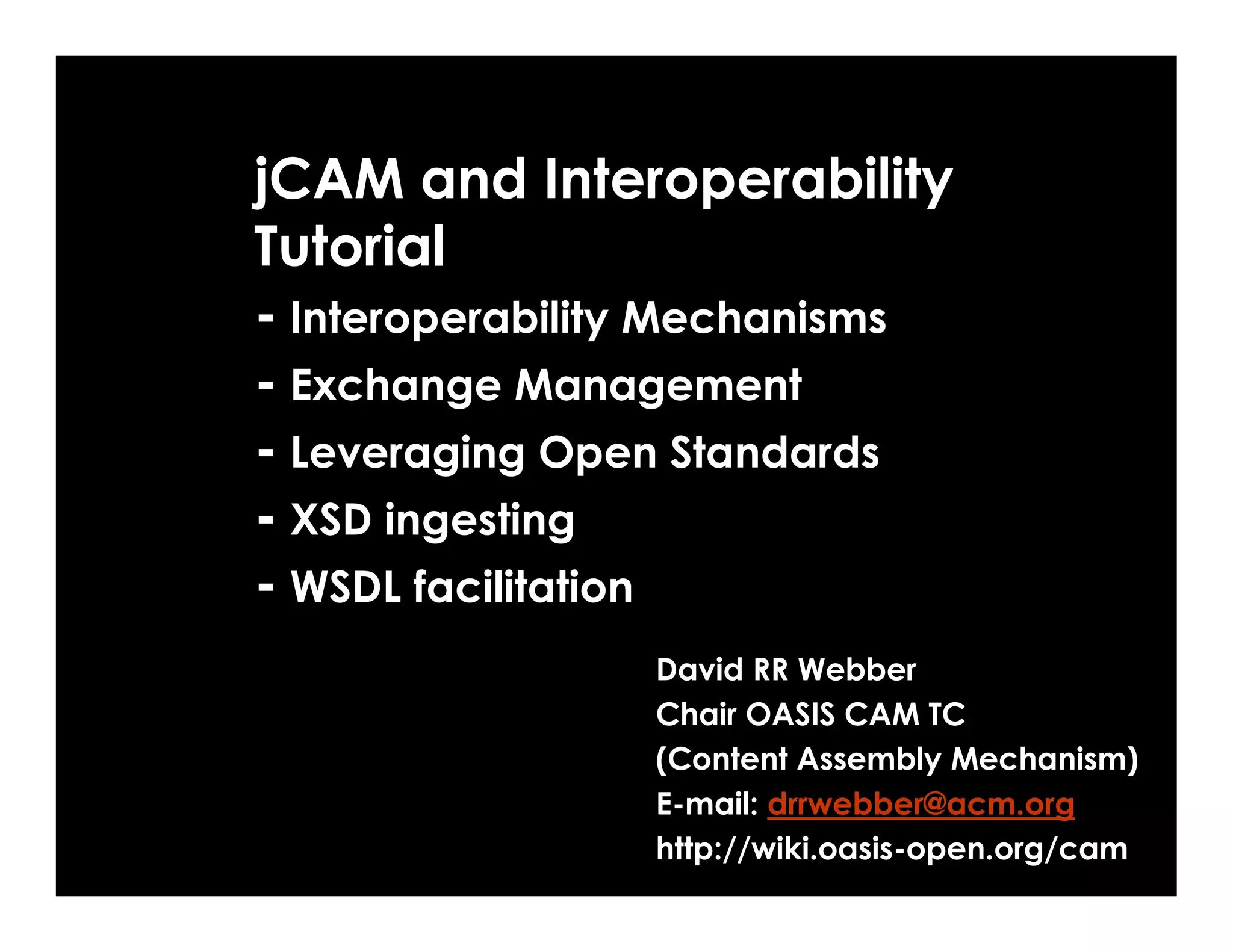 The document discusses tools and standards for improving interoperability between systems exchanging information. It describes an approach using open standards like XML, XSD and CAM to generate documentation and test cases from an XSD schema to create an "Information Exchange Package" for validating interoperability. The tutorial explains how to use the jCAM editor to ingest an XSD schema, document exchange patterns by creating a "want list", generate a subset XSD and test cases, and run conformance testing to verify interoperability.