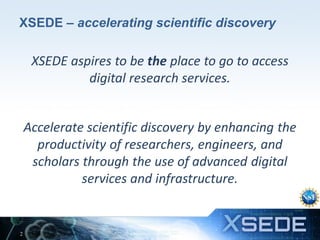 XSede is an advanced digital services ecosystem aimed at accelerating scientific discovery by enhancing researcher productivity through diverse resources and services. It has strategic goals to deepen, extend, and sustain its infrastructure while collaborating with international computing infrastructures. Supported by a five-year $121 million grant from the NSF, XSede focuses on innovative and reliable service delivery to a broad scientific community.